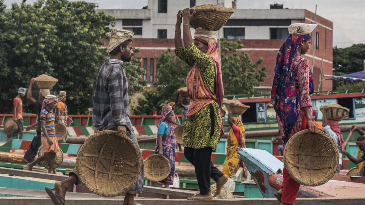Workers unload sand from a cargo ship at Balurghat of Gabtoli in the capital. Rendered jobless by the nationwide shutdown previously put in force to tame the spread of coronavirus pandemic, the working class people are gradually getting back their lost pace amid reopening in all spheres. Photo: Salahuddin Ahmed/TBS.